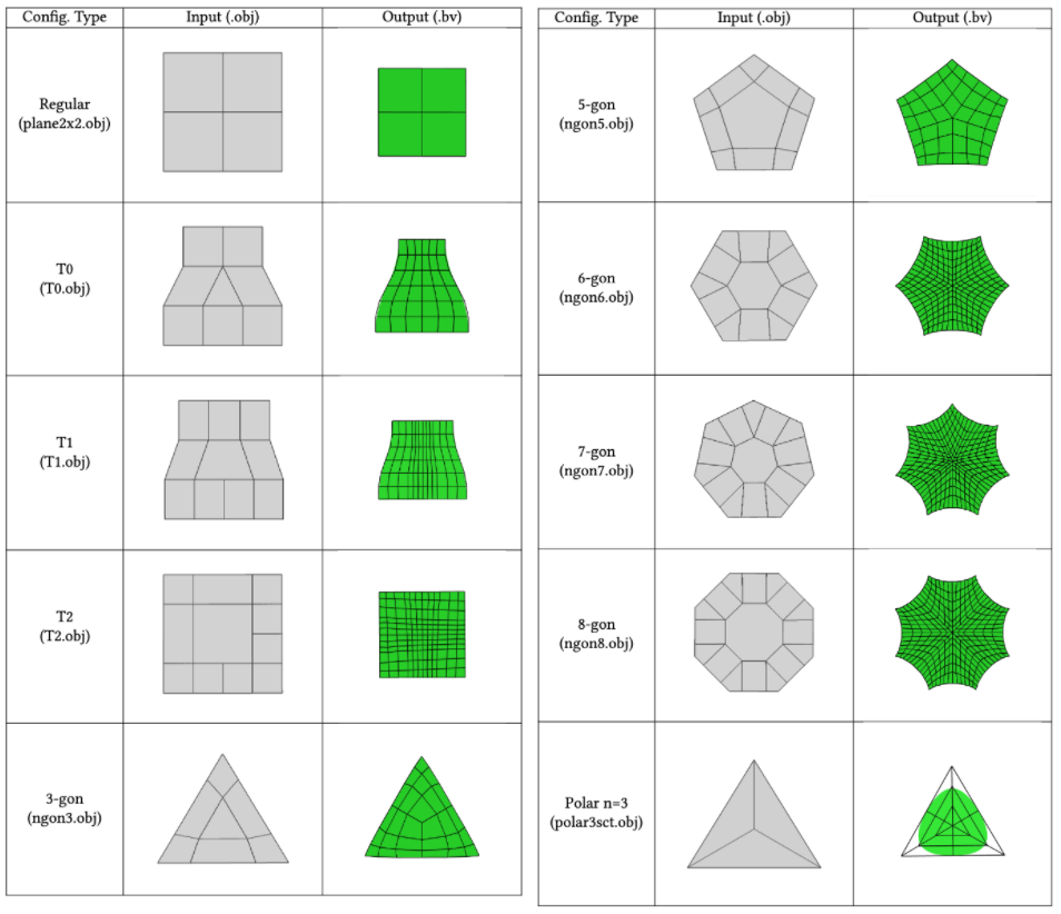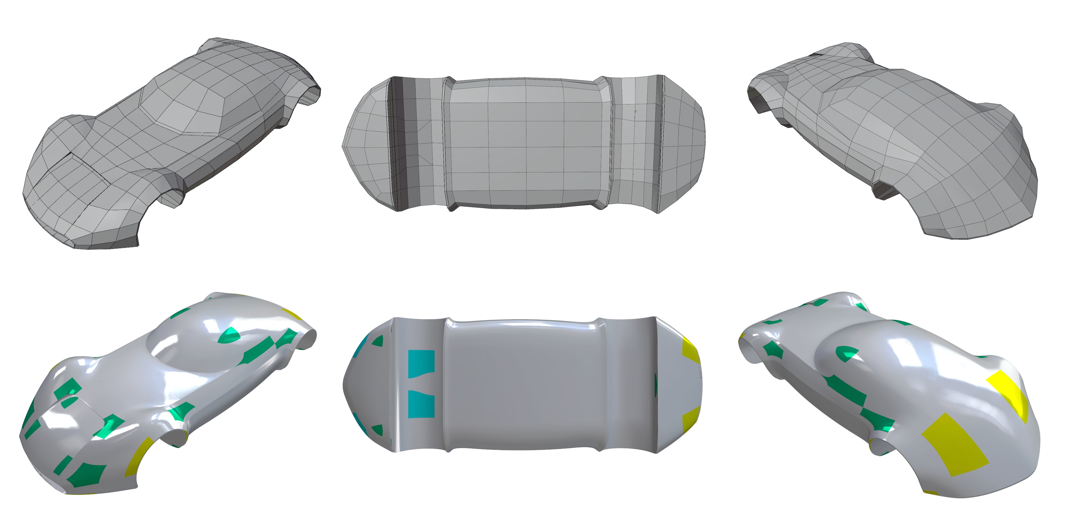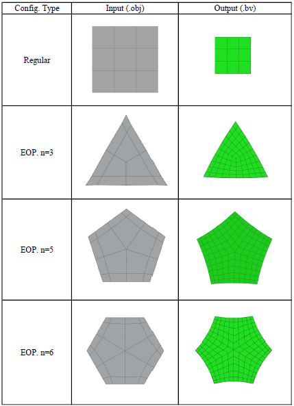 Top: input mesh, Bottom: B-spline patches generated by Polyhedral-net splines (Gray: regular Bi-2, Green: extraordinary point, Cyan: T0, Yellow: T1)