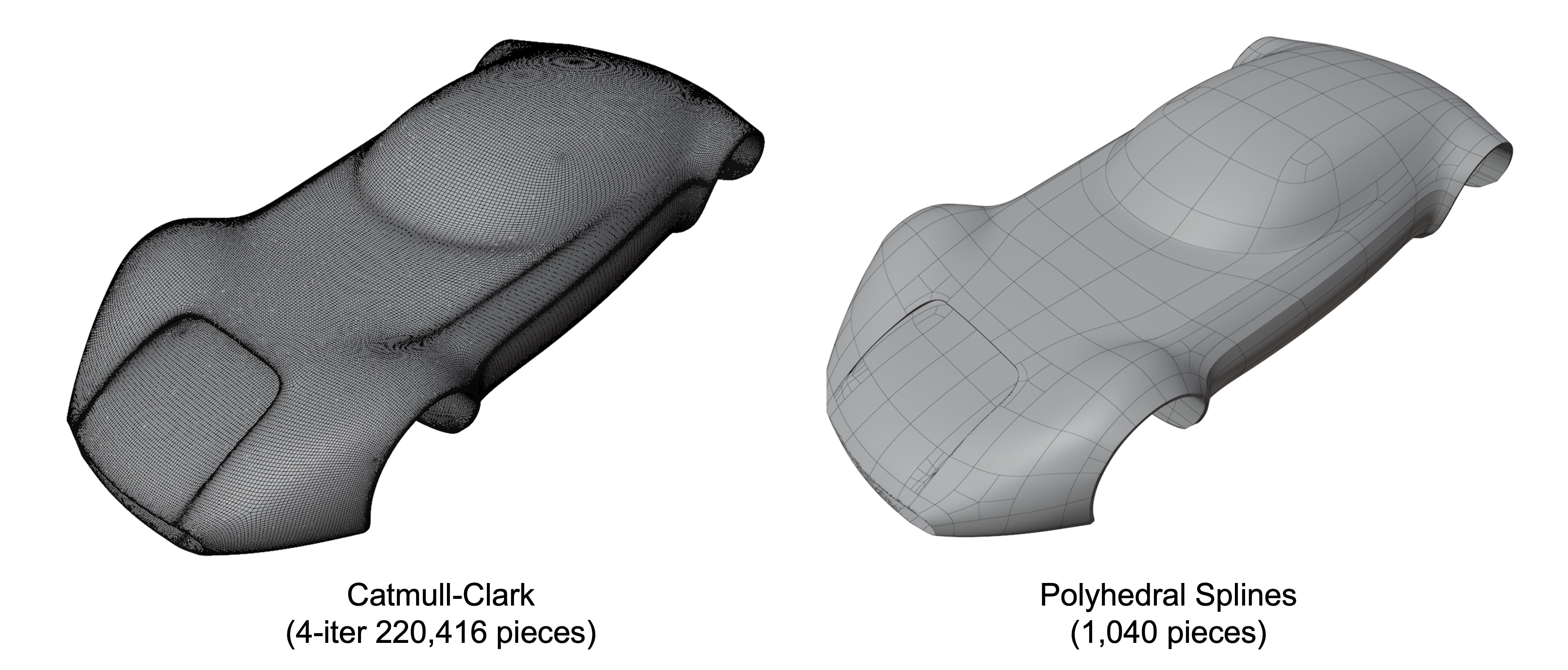 Polyhedral-net splines convert a polyhedral-net into piecewise low-degree Bezier patches.